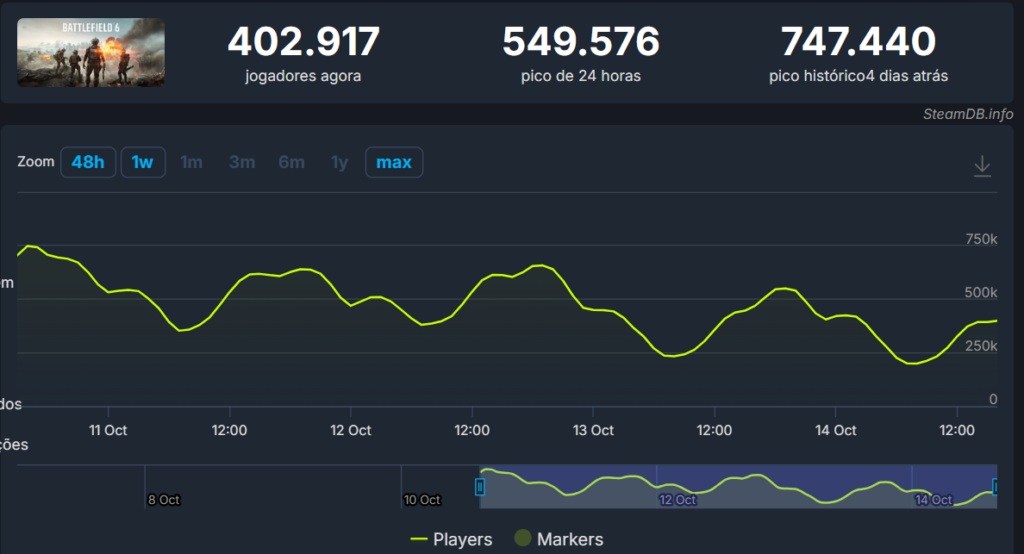 Segundo dados oficiais do SteamDB, o jogo atingiu um pico de 747.440 jogadores simultâneos durante o seu primeiro fim de semana. Esse número não apenas consagra Battlefield 6 como o maior sucesso da EA na plataforma Steam, mas também o coloca entre os 15 títulos mais jogados da história do serviço. Para efeito de comparação, Apex Legends, que antes detinha o recorde interno da editora, havia registrado 624.473 jogadores em 2023.