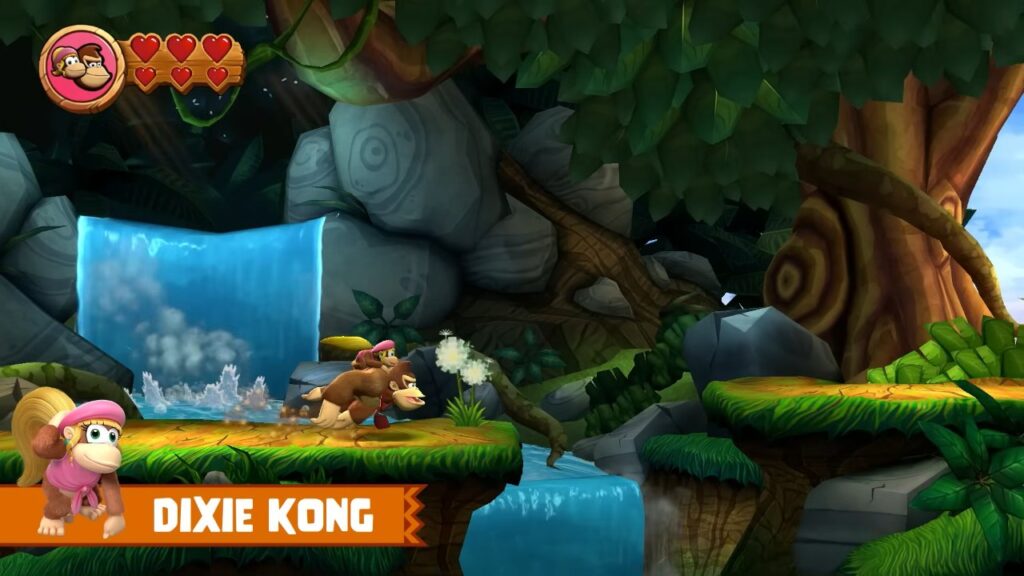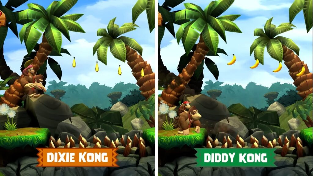 No modo solo, ao coletar um barril de parceiro, o jogador pode escolher se prefere Dixie ou Diddy acompanhando Donkey Kong. Já no modo cooperativo local, o segundo jogador pode alternar entre os dois personagens diretamente no mapa-múndi, usando o direcional analógico. Essa flexibilidade muda a dinâmica de várias fases e oferece novas possibilidades estratégicas.
